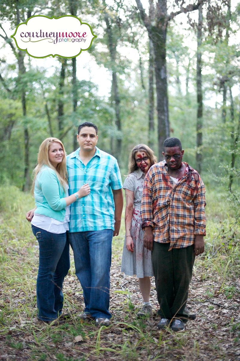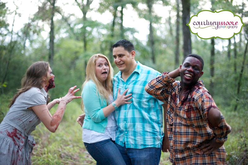 Katy and John’s engagement session was this past week and it was SO much fun! The weather cooperated with us for the most part- it was actually pretty eerie and foggy which was PERFECT because Katy planned to surprise John with a Zombie attack during their session!!! We (Katy and I) were both pretty nervous about it- I thought I was going to scream and freak out and run away or something. Thankfully I didn’t even though they did a GREAT job with make up and stuff- it was kinda gross! Anyway, their wedding will be next month at Huntsville State Park (no Zombies will be present, at least I don’t think they will be 😉 ) in the forest so it was only fitting that we did the engagements there too! Enjoy this fun sneak peek!